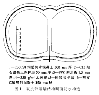 深圳地铁区间隧道防水施工技术摘要: 介绍了深圳地铁一期工程防水设计概况, 对区间隧道的防水措施、施工缝和变形缝的防水处理以及隧道与车站接口处防水处理等作了介绍, 并提出了几点施工体会。关键词: 深圳地铁; 区间隧道; 施工缝; 变形缝; 防水措施 深圳地铁一期防水工程在初始阶段就得到了上级领导的高度重视, 对设计和材料两大源头进行了严格控制, 并在防水施工过程中层层把关、精心管理, 保证了深圳地铁防水工程质量始终处于受控状态, 实现已交验工程 100%的合格率。1 深圳地铁一期工程防水设计概况 深圳地铁工程地质情况主要是第四纪填土、粘土、砂层、变质砂层和变质花岗岩等, 地下水为第四系孔隙水, 水资源丰富。为避免将来给地铁运营带来隐患, 深圳地铁防水设计确定以“高标准、多设防、求保险”为方针, 遵循“以防为主、刚柔结合、多道防线、因地制宜、综合治理”的原则, 采取了全包防水、半包防水、复合防水和混凝土自防水等多种形式。其中, 区间隧道防水设防等级为二级, 遵循“以防为主, 刚柔相济, 多道防线, 因地制宜, 综合治理”的原则; 采用主体结构钢筋混凝土自防水加支护结构外包柔性防水层的做法, 其核心是“以结构自防水为本, 附加防水层为标”。项目实施过程中, 除严格按照设计要求和正确的操作程序施工外, 还对防水工程的施工组织、技术保证等方面采取了有效措施, 以确保防水工程质量。2 区间隧道的防水措施 深圳地铁一期工程设计了双拱带隔墙结构、单洞双线结构等隧道断面形式, 不同衬砌断面的防水构造基本相同, 其底板防水构造层次见图 1 所示, 拱圈和边墙部位除未设保护层外与底板构造相同。在施工时工程采取了以下措施: