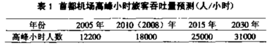 2 轨道交通方式 轨道交通依据交通容量范围可划分为特大、大、中、小容量四种系统,按敷设方式可分为隧道(包括地下、水下)、高架和地面三种。按支撑形式或牵引方式可分为轮轨接触系统和磁轨接触系统,前者包括市郊铁路、地铁、轻轨、有轨电车,单轨、胶轮轨等,后者包括直线电机LIM,磁悬浮等。2.1 市郊铁路 市郊铁路相当于在市区和郊区间的铁路,其编组灵活,能实现高效运输,最大可按10~12辆编组,单向每小时最大运送能力可达68万人,与地铁、轻轨等轨道交通形式相比,市郊铁路具有速度高,站间距大,运送能力强等特点。2.2 地铁 地铁多建于超大城市或特大城市市区内部,轴重普遍大于13t,可达到单向高峰小时断面流量4万人次以上,属于大容量快速轨道交通系统。运营速度一般为35~40k/h,最大车速可达80k/h。可吸引大量客流,还可建为综合换乘中心和商业服务中心,充分利用地下空间,缓解城市用地紧张状况。但地铁造价昂贵,建设周期长。2.3 轻轨 轻轨一般用于中等城市或交通状况较好的大城市或特大城市市区外围卫星城、旅游景区、经济开发区等与市区联系的交通干线,轴重普遍小于13t,单向小时客运能力1~4万人。24 磁悬浮 目前比较成熟的磁悬浮铁路技术主要有日本的超导超高速磁悬浮ML(Maglev)、德国的常导超高速磁悬浮“运捷”TR、日本航空的常导中低速磁悬浮HSST三种。2.5 直线电机LIM 直线电机LIM也称为轮轨直线电机铁路,简称直线电机客运系统、直线电机系统、直线电机铁路、直线电机地铁。它是介于磁悬浮与传统轮轨铁路之间的交通方式,在支承方面与轮轨系统相同,即利用车轮起支承作用;但在驱动方面却采用了磁悬浮铁路的方式,即采用直线电机牵引。3 LIM轨道交通特色3.1 造价更低 由于LIM利用感应原理来推动车辆前进,不需要将旋转运动转换成直线运动,从而省去了齿轮箱等一系列传动机构。这样,车厢底板面可以大大降低,从而减少车体断面的尺寸。安装直线电机的车辆断面比传统车辆小,宽度为89%、高度为77%。3.2 良好的选线特性 直线电机车辆不受轮轨之间粘着限制,因此具有较好的爬坡能力。常规铁路的坡道一般不超过3%~4%,采用直线电机后坡度可以增加一倍,可达6%~8%。因此非常适合城市轨道小曲线、大坡度性能的需要。有利于城市轨道交通选线,达到较好的工程、经济性能。3.3 良好的牵引和制动性能 将直线感应电动机的定子部分安装在车上,转子部分变成一条感应轨,铺设在两个走行轨之间。当通过电流时,定子和转子两部分产生的磁场相互作用,直接拖动车辆运行和实现车辆制动。由于牵引力和制动力均来自磁场间的相互作用,这种非粘着性驱动不受车轮与轨道间摩擦系数的影响,与普通标准地铁相比,可产生较高的启动加速度和制动减速度。3.4 安全性好 列车可以采用全自动化运行控制方式,安全程度高。站内装置了安全监测系统,接收到异常信息会立即自动命令列车紧急停车。3.5 运送能力适中 运送能力可以达到每小时3万人次,在具有一定规模的地铁网络中能发挥其应有作用,非常适合中小运量。3.6 噪音低 由于驱动系统没有任何旋转部分,其运行噪音可以维持在很低的水平。直线电机列车可使噪音水平降至70dB以下(测量处距轨道中心10m,车速为60km/h),比普通地铁降低10dB左右。3.7 养护维修及其他 直线电机的应用大大减少了侧滑及空转现象,可以节省养护维修费用。4 首都机场线采用LIM轨道交通方式的可行性 首都机场线主要输送民航客流和接送客流,表1是首都机场高峰小时旅客吞吐量预测。