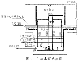 2.3 主废水泵站设计 主废水泵站主要排放结构渗漏水、凝结水和生产、冲洗及消防废水等, 应设在车站或线路的最低点, 其设计关键是确定废水池容积和废水泵参数, 车站主废水泵应设置 2 台, 平时互为备用和轮换工作,消防或必要时同时工作, 排水泵流量按消防时排水量和结构渗水量之和确定。主废水池有效容积按照主废水泵 20min 出水量且不小于 30m3 确定。主废水泵站剖面如图 2 所示。