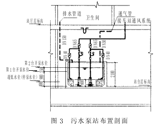 对于部分地铁车站与地下商业建筑合建的情况,笔者认为为了避免商业建筑火灾时对地铁车站的影响, 应在两者之间设置挡水和截水措施, 商业部分内部应设置独立的局部废水泵站。3 车站污水泵站设计 地铁车站的污水主要来源于车站工作人员日常用水, 一般在车站的站厅层设备区内设有卫生间供工作人员使用, 生活用水量按 50L班/人计, 排水量按生活用水量的 95%考虑。 污水泵站应设置在卫生间下的站台层设备区内,污水集水池有效容积一般按 6h 的污水量确定, 但有效容积不应小于 2m3, 污水泵流量按卫生间排水设计秒流量选取。在实际设计中, 污水池平面不宜过大,以免污水在污水池内停留时间过长, 同时污水池应设置排气管道, 直接与车站排风管道连接。污水泵站布置剖面如图 3 所示。