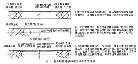 (5)混凝土的密实性 混凝土自身越密实,则其抗渗漏性能越好。由于地下连续墙混凝土的浇筑属于水下浇筑混凝土,其特殊的构造导致了不能对混凝土进行机械振捣。在这种情况下,主要依靠混凝土的自重使其密实,这种混凝土即自密实混凝土。而影响其自密实性能的主要为:粗骨料与固体混凝土的体积比,细骨料与砂浆的体积比以及水灰比。一般地,粗骨料与固体混凝土的体积比越小,细骨料与砂浆的体积比越小;而水灰比越大,则自密实性越好。2本工程中所采取的有效防渗漏措施2.1 针对连续墙结构采用的防渗漏措施 (1)在东西端头井(双衬墙)连续墙施工中,采用了复合锁口管连接的墙体接头新工艺。其基本原理为:用接头箱和反力管复合而成的复合接头管代替单根接头管,把普通接头管当作止水接头(如图3所示)。 (2)在标准段(单衬墙)连续墙施工中,采用了刚性十字钢板接头。将十字钢板焊接在连续墙钢筋笼上,利用接头箱保护成墙后的墙体接头面,待吊放钢筋笼之前拔出接头箱。采用这种刚性接头可在很大程度上减少连续墙接缝的漏水情况,可有效保证单衬墙防渗漏水的施工质量。 (3)为了防止预埋接驳器的部位渗漏水,在预埋接驳器迎土面加焊了防水钢板(如图4所示)。