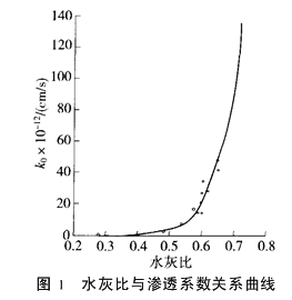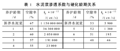(2)养护龄期 随着混凝土养护龄期的增加,水泥浆水化作用逐渐完全,水化产物(凝胶体)填充毛细孔,降低了混凝土的透水性。表1为水泥浆渗透系数与养护龄期的关系表[1]。