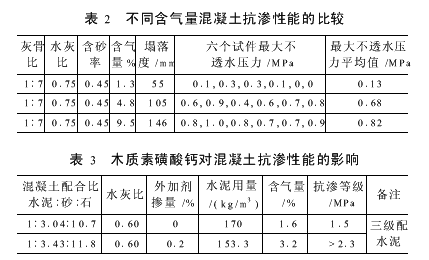(4)外加剂 混凝土的抗渗能力随含气量的增加而提高。表2为掺引气剂混凝土的抗渗性[1];表3为掺木质素磺酸钙混凝土的抗渗性[1]。
