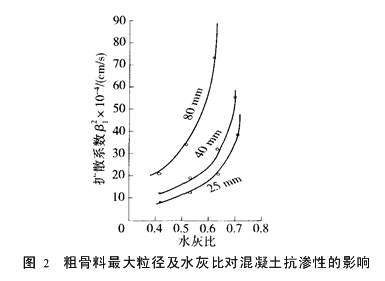 (3)粗骨料最大粒径 在水灰比固定的情况下,石子最大粒径越大,混凝土的抗渗性越差。图2为粗骨料最大粒径为80mm、40mm及25mm的混凝土扩散系数对混凝土抗渗性的影响[1]。
