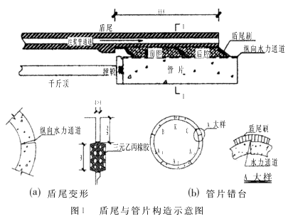 ⑶管片碎裂:在轴心线未产生较大偏差的状态下,组装工艺不合理或野蛮施工,K块管片安装时没有足够的空间,采用盾构千斤顶强行顶进,造成相邻管片外壁处(尤其螺栓孔、角根部)在千斤顶高压状态下顶裂或破碎,而带进盾尾舱,损坏盾尾刷,形成渗水通道而造成漏浆。 ⑷防治措施 ①加强拼装施工培训,提高拼装人员的技术水平,要求管片不拼成椭圆形,且一环管片安装后必须使用整圆器进行整圆,以减少椭圆和纵缝、环缝错台的现象。 ②在每次管片安装前,应清除盾体内的渣土,避免安装管片时难以对位,造成错台现象。 ③封顶K块拼装前,必须调整好开口尺寸,使封顶块能顺利插入到位。 ④管片构造可减小管环纵缝沿止水条外缘的构造缝宽度和高度(原设计分别为33.2mm和6mm),建议高度<20mm,以减少渗漏水力通道。2.2背填注浆 盾构机在掘进过程中,由于操作人员技术不熟练或双液浆配比不合理,使浆液凝固时间过短,造成浆液不能充分填充管片后空隙,而是堆积在注浆口附近,造成注浆通道受限制,后续浆液压力(一般控制在切口压力+(0.6~1.0)kg)必然剧增,当浆液压力高于盾尾刷和油脂的抗压力时,就会击穿盾尾刷和油脂衬背而造成窜浆。因此在施工中必须严格控制双液浆的配比,经常进行试验和现场抽检,确保其凝固时间为12~14s,另在注浆压力剧增时应立即停止注浆,查明原因或者更换孔位后再进行注浆。2.3泥水压力过大 由于在环流系统操作时开挖面的泥水压力设定值过高,或切削下来的岩块堵塞排泥管道口或泥水舱,都有可能导致泥水舱内泥水压力过高,超过盾尾刷的抗压能力,瞬间击穿盾尾刷而造成漏浆。 在泥水加压式盾构工法中,切口水压设定通常应与作用在开挖面上的土压保持平衡,水压与开挖面上含水土体垂直作用的重力和土的内摩擦角有关。设P0为土压(含水压),即自然状态下盾构机头部2/3高度处的压力,则切口水压=P0+(0.01~0.02)MPa。动工前应在隧道线路上的多个地点进行土质和地下水调查,决定每个地点的设定切口水压。在管道发生堵塞时,若开挖面水压高于上限值则应立即暂停掘进,通过旁路调节使压力从逸流阀卸掉,开挖面水压恢复正常后逸流阀自动关闭,再把泥水送进土仓进行逆洗清通管路,或通过检查判断具体堵塞位置后人工清除岩块。2.4盾尾油脂量和压力不足 在盾构掘进过程中,盾尾刷与管片的摩擦消耗的油脂与掘进速度成正比,速度过快则注入盾尾的密封油脂在单位时间内不能满足其消耗量,若不及时调整油脂泵注脂率,则盾尾刷内的油脂量和注入油脂的压力不能及时密封盾尾,势必造成尾刷的密封效果减弱,形成盾尾渗漏。 在地铁三号线盾构施工中,我们有针对性地采取了以下措施:①采用法国产的优质盾尾油脂,可耐负压5kg/cm2;②采用正确方法补充油脂,并合理保养维护,按理论计算正常补油脂单孔约为36s,每隔5R补充一次。但考虑到管片外壁质量,管片姿态和组装质量等问题,一般在2R~3R要补充一次,但发生漏浆后必须进行漏浆处局部打油脂,如背填浆液漏浆,则最好进行局部清洗;③当发生严重渗漏或窜浆现象时,采用盾尾全舱处理法,以确保油脂舱内有足够的量和压力,并清除盾尾舱内的杂物。具体做法是从内圈开始,也就是千斤顶推至1505mm处,从上往下在内圈单孔打油脂,把相邻孔逆止阀打开至干净油脂溢出后停机,再从溢出孔处继续打油后把相邻孔打开,依次环向进行一周,再将千斤顶推至1877mm处,在外圈进行上述操作。2.5盾尾密封损坏 其原因如下:①盾尾刷密封装置受偏心管片过度挤压后产生塑性变形而失去弹性,密封性能下降,在压力作用下导致浆液渗漏;②泥水盾构停止掘进时,土舱内有泥水的压力作用,管片组装时很易导致盾尾后退,造成盾尾刷与管片间发生刷毛方向相反的运动,使刷毛反卷,盾尾刷变形,密封性能下降而造成渗漏。防治措施包括:①严格控制盾构推进的纠偏量,尽量使管片四周的盾尾间隙均匀一致,减轻管片对盾尾刷的挤压程度;②控制盾构姿态,严格控制管片组装时的千斤顶伸缩量,避免盾构产生后退;③在条件允许的情况下,可更换第3道即最里面一道盾尾刷,以保证盾尾刷的密封性。3结束语 泥水盾构盾尾渗漏涉及到管片拼装、切口泥水压力、盾尾注浆压力、盾尾油脂等多种因素,因此施工中必须在认真分析原因后采取切实可行的措施,慎重对待,以确保工程施工的进度与质量。参考文献[1]张凤祥,朱合华,傅德明.盾构隧道[M][2]朱伟译.隧道标准规范(盾构篇)及解说[M][3]项兆池,楼如岳,傅德明.最新泥水盾构技术[M]