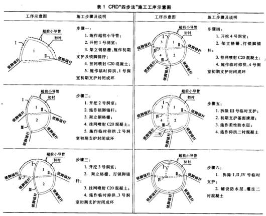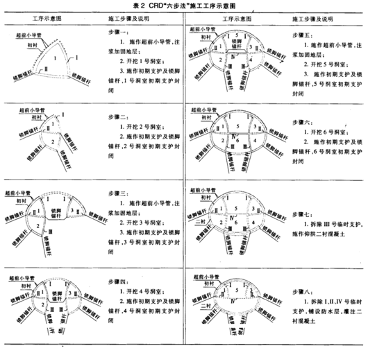 1超前预加固 施工中,开挖前对围岩采取了预支护等辅助施工措施,一般地段在隧道拱部150°范围内采用小导管注浆加固;对流塑状黏性土地段拱部采用水平旋喷桩加固;在边墙和底部采用小导管注浆加固;掌子面采用封闭小导管注浆加固。从而确保了区间隧道掘进的施工安全。 1)小导管注浆超前预加固参数:小导管为热轧无缝钢管,外径42mm,壁厚4mm,长度3.5m,制成钢花管。环向间距为30cm,纵向间距为2.0m。施工时超前小导管紧靠开挖面的格栅钢架为支点打入,然后注浆,形成超前支护环后进行开挖,每开挖50cm后立即架立格栅钢架,喷锚支护。小导管搭接长度不小于1m,外插角采用18°。注浆浆液:一般地段采用425号普通硅酸盐水泥浆液,水灰比为0.6~1,浆液里添加2%的氯化钙;流塑状黏性土地段,采用水泥水玻璃双液浆,水泥浆与水玻璃的体积比为1:1,水灰比采用0.6~1,水玻璃浓度为35波美度,添加5%的氢氧化钙速凝剂、3%的磷酸氢二钠缓凝剂,注浆压力0.5~1.0MPa。 2)水平旋喷桩预加固及掌子面封闭注浆参数: (1)水平旋喷桩:加固长度10.5m;钻孔填充长度3.5m;循环长度4.9m;水平旋喷桩直径Φ500mm;外插角5°;环向间距开孔0.30m、终孔0.35m。 (2)掌子面注浆管采用Φ42mm;袖阀管长7m;循环加固长度4.9m;掌子面采用C20网喷混凝土封闭厚300mm;采用后退式注浆,后退长度0.6m;浆液扩散半径0.6m;注浆量0.54m/m3;注浆压力0.5~1.2MPa。 3)水平旋喷桩施工时,先用水平钻机钻孔。横向高压旋喷钻机就位时,机座要平稳,孔位误差不得大于50mm,倾角与设计误差一般不得大于0.5°。钻进过程中,在钻孔前端加设限位卡,严格控制水平旋喷加固体外插角和分叉偏差,以确保每根加固体的准确定位和加固体之间的咬合厚度。一旦发现偏斜,特别是向下偏斜,应及时纠偏。采用水泥浆回灌钻孔,然后重新开孔的方法进行纠偏。2CRD“四步法” 喇叭口单孔双线段的SK3+449~+424段、SK3+341.29~+366.29段,地质为强风化花岗岩,褐红色,中粗粒斑状结构、块状构造,属III类围岩。施工时,采用小导管超前注浆加固。2号线接口喇叭SK3+278~+303.66段地质为流塑状黏性土,褐红色、褐黄色,含水饱和、呈流塑状,为中高压缩性土,属II类围岩。施工时,采用水平旋喷桩和小导管注浆超前预加固。该三段区间隧道开挖宽度小于10m,开挖高度小于8m,采用CRD“四步法"掘进初支。 开挖施工时,各开挖部位掌子面间要错开一定的距离,一般为5~8m,以减小同步开挖相互间的影响及引起地表较大沉降。具体施工步骤见表1。