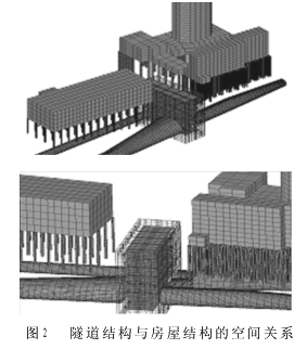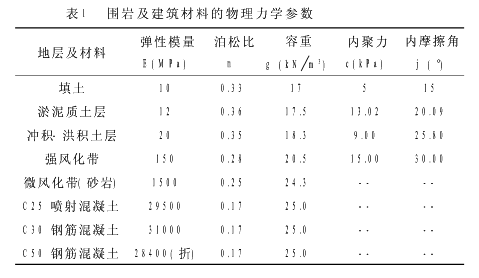 3 工程地质 本段地层自上而下分别为:杂填土5.6m,淤泥质土1.5m,淤泥质细砂8.7m,淤泥2.45m,粉质粘土1.45m,强、中、微风化基岩层。本段地下水较丰富,与珠江水系联通,隧道拱顶埋深约24~29m,主要位于中、微风化岩层中,局部位于强风化地层。围岩及建筑材料物理力学指标见表1。4 预测方法与模型 预测分析采用三维有限元施工模拟法结合类比法进行,有限元计算为充分模拟隧道的三维空间效应,计算模型所取范围是:从如意坊车站端部开始,沿地铁线路方向,包含小交路区段的大约200m纵向(Z轴方向,起点为YAK7+112)范围。考虑隧道开挖应力重分布的影响,以隧道区域为核心,横向(X轴方向)范围取130m,竖向(Y轴方向)取至地面,下取至隧道地板下约40m,结构物模型如图2所示。在模型范围,地铁工程的结构物有小交路暗挖隧道,12m×28.6m×38m的施工竖井,以及盾构隧道,民用建筑物有广铁南站车间及多层住宅楼及其桩基(A9)、如意坊一号仓库及其桩基(A5)和1幢高层及其桩基。模拟计算采用ANSYS有限元通用程序,整个模拟过程中有限元模型共划分为22.3万个单元,计算中初衬、二衬和管片采用弹性壳单元模拟,群桩用空间梁单元模拟,其余桩基及地层及均采用弹塑性8节点空间实体单元模拟。其中建筑物桩基均按端承桩考虑,与地层的连接采用耦合一定自由度的方法实现。