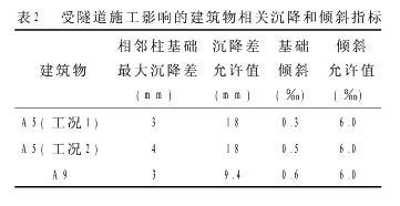 5数值模拟结果与分析5.1隧道施工对建筑物的影响范围 根据典型横断面在不同施工步时的沉降曲线(图略)以及隧道横向地表沉降曲线图,可得出几个横断面的横向影响范围,其中最大影响范围约从-30~60m,共计90m。5.2对建筑物产生影响的小交路隧道范围⑴对A5产生影响的隧道范围 根据A5段地表特征点位移的开挖影响线(图略),可得出隧道的纵向影响范围,由于断面大小不同,在此选取最大影响距离作为共同的纵向影响值。在隧道掌子面前方的最大影响范围约35m,后方的最大影响范围为60m。⑵对A9产生影响的隧道范围 由于A9段隧道为对向施工,因此横坐标选用施工步,根据A9段地表特征点位移的开挖影响线(图略),可得出隧道的纵向影响范围,由于断面大小不同,在此选取最大影响距离作为共同的纵向影响值。在隧道掌子面前方的最大影响范围约30m,后方的最大影响范围为50m。5.3受隧道施工影响的建筑物安全评价 以A5为例,分析其位移的变化过程,从各施工阶段建筑物及桩基的位移图可以看到建筑物的位移和倾斜逐渐增大,桩顶最大沉降为24mm。为进一步对A5建筑物的安全进行评价,选取A5建筑物的两条水平地面基线即AB线和AD线进行评价。根据不同施工阶段的沉降曲线(图略),可见位移值不断增大,建筑物向大跨断面方向的倾斜也逐渐增大。 根据规范,各建筑物的沉降和倾斜指标都在允许范围内(见表2),但由于计算中并未计及也无法计算失水沉降的影响,根据以往施工经验,失水沉降值较大,可能使沉降和倾斜值超限,因此建议在设计和施工中要有充分的止水措施,或根据经验并结合试验采用以堵为主、限量排放的方法。