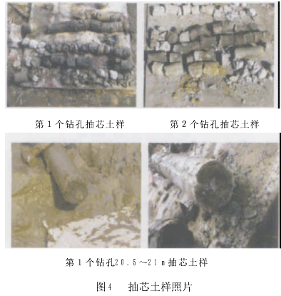 修改后的加固方案,共完成旋喷桩47根,旋喷压力达23MPa,其中左后方完成19根,右后方完成28根,水泥用量为79t;完成袖阀管64根,袖阀管注浆压力为1MPa,其中东侧完成30根,西侧完成34根,水泥用量为92t,水玻璃用量为10t。旋喷桩及袖阀管施工时均加入了一定量的速凝剂,达到缩短凝固时间的效果。 2005年2月28日加固施工完成,3月3日下午对加固体进行了部分抽芯检查。共抽芯2个孔,抽芯深度为地面以下17~22m,部分抽芯照片如图4。从抽芯取样情况来看,从17m即有浆液扩散,加固体内浆液扩散较均匀,19m以下深度取样较连续,在21.5~22m范围有全风化混合岩地层出现。抽芯程段状,不连续,其原因可能是加固不均匀所致,不适合进行敞开土仓换刀作业。经研究分析,认为加固过程中注进了220t水泥,掌子面应该有一定的稳定性,因此,决定土仓带压换刀作业。带压换刀作业从3月13日开始,到4月6日换刀作业完成,共用25天时间,更换单刃滚刀28把,双刃滚刀4把。换刀作业完成后恢复掘进,盾构机运转正常。4结束语 本次盾构机施工过程中出现的地面塌陷问题,经过采取科学合理的加固技术措施,地面塌陷得到了控制,这对今后的工作有很好的技术借鉴作用,可总结如下几方面经验。 (1)根据刀具配置情况,收集刀具在各种地层的磨损程度,同时根据本项目的盾构机在相同的地质条件下掘进的磨损情况,来判断刀具对地层的适应性,并分析判断在掘进多长距离时,需要开仓检查刀具。本次地面塌陷就是忽视了掘进距离与刀具磨损情况的分析,在强风化混合岩、中等风化混合岩、微风化混合岩地层地层中掘进110环,而未检查换刀。导致盾构机遇到不良地层时就无法正常掘进。 (2)施工过程中要注意检查、记录土仓温度及排出渣土的温度,当渣土温度比正常情况偏高时,要注意检查刀具。本次施工过程渣土的温度明显很高,人在隧道内行走感觉比平时热很多,所出的渣土都冒热气,但这些情况没能引起各方的警惕,耽误了及时开仓的时机。 (3) 勤检查、勤换刀应作为盾构施工管理的常理。本次地面坍塌,其中一个原因就是当初分析前方有仑头海断层,估计会喷涌严重,不利于开仓检查,所以没有对刀具进行检查,错过了换刀机会,以致遇到上软下硬地层时就无法掘进了。 (4) 盾构施工要特别注意分析整个项目的地质情况,对不良地层要充分分析其对施工所可能产生的影响,并采取有针对性的处理措施,而不能有侥幸的心理。 (5) 采用斜打袖阀管加固是本方案最成功的地方,解决了钻孔桩难以成孔、进尺缓慢的困难,极大地缩短了加固时间。袖阀管加固可以推广应用到其他需要加固的工程中。