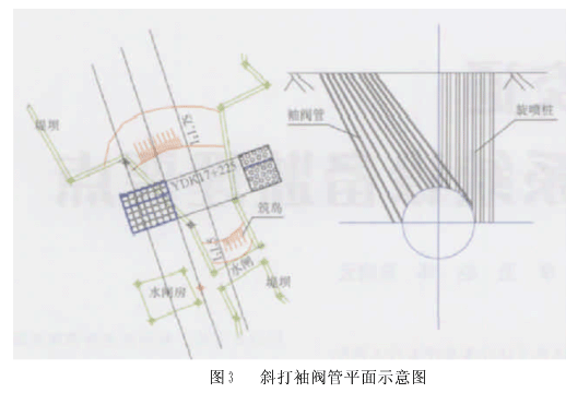 最初的加固方案确定后,在施工钻孔桩过程中,成孔进尺相当缓慢,从钻出的渣样看是花岗岩片石。经调查,原有堤坝基础施工时有回填片石(是花岗岩片石),并且堤坝基础为钢筋混凝土结构。这样,钻孔桩和旋喷桩的施工都极其困难和相当缓慢。因此,必须对原有加固方案进行修改,以适应工期的需要。考虑到该处无法运输混凝土,要灌注混凝土只能通过用船从海上运输,并且泵车也得用船运来,并在船上进行灌注混凝土,由于海水的涨退潮关系,混凝土的输送管道需100多米长,在海面上难以架设。因此,加固方案修改为利用旋喷桩+斜打袖阀管至盾构机顶部然后进行压注水泥浆,改善淤泥层范围内的土质,增强强度。加固宽度为3m,刀盘前进端1m,刀盘后退端2m。在隧道右侧以旋喷桩加固,刀盘后面加固深度到达盾构机外壳,刀盘前面加固深度到隧道中线。由于刀盘处左侧位于水闸底板,在侧面利用袖阀管注浆加固。修改加固方案见图3。