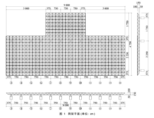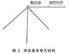 3 工程特点及难点 屋架结构是由纵向主桁架、悬挑桁架及支托组成的空间结构。高空拼装过程中,在屋面拉杆未安装前各构件的受力状况与设计受力状况是不同的,施工过程中的主要施工工况需计算核定。 由于工程跨度大、重量大、构件尺寸大,在组装和拼装过程中的刚度、稳定性、挠度、杆件内力等要进行施工验算,必要时需采取加固措施。 由于工程构件长度及截面尺寸都较大,整体连接必须在工地进行,这就要求对施工组织、工厂生产调度、构件运输调度等问题要精密组织,保证工地顺利拼装。 控制屋架下沉量为本工程的难点之一。屋架安装需要根据安装方案进行工况计算,以满足拆除临时支撑后的工况内力接近屋架在该阶段的设计内力。屋架材料安装完毕拆除支撑后,中点挠度值应小于19cm。4 主要施工方法4.1 空心钢球及钢管杆件的制作 为了保证网架的安装质量,所有空心钢球节点和钢管杆件均在工厂集中加工。钢球采用胎膜加工,原材料为45号钢。采用车床切边,加工允许公差为:直径偏差±1mm,球椭圆度偏差<1mm。钢管杆件长度允许偏差为±1mm,杆件端面与杆轴线必须垂直,其允许偏差为0.5%R(R为钢管半径),钢管杆件的最大弯曲不得大于1/1000杆长。4.2 钢网架的安装 以计算机模拟理论为依据和指导,制定了详细的拼装方案。根据工程结构特点和施工现场平面布置情况,在地面搭设脚手架工作平台,在脚手架上平铺木板,然后在脚手架工作平台上组拼网架,网架的拼装采用空中散装法进行施工。 根据网架结构的实际情况和左右对称的特点,为了减小网架在拼装工程中的误差积累,整体网架的组拼应从起步单元8轴、9轴之间开始,先组拼起步单元的纵横轴,随时校正尺寸,在认为起步单元网架无误后方可从中心向两侧展开。拼装过程中由扒杆将杆件吊装到位,在设计位置进行拼装栓接。 (1)组装施工平台 首先将原地面进行地基处理,确认能够满足承载力要求后再搭设脚手架施工平台,顶面采用1cm厚木板平铺,平台平面尺寸应大于网架1m左右,施工平台顶面标高应低于下层网架标高300mm。 (2)起步单元的组拼 直接将单根杆件、单个节点拼装成网架,在拼装过程中每个节点的位置都应测量复核。起步单元的网架安装完成后,立即进行自检,保证所有节点处的螺栓紧固到位。进行定位电焊(每个支座处焊接3点),以保证网架在后面的安装过程中不产生位移。然后分别以起步单元为中心向两个方向同时拼装。 (3)基本单元的拼装 起步单元以外的网架采用空中散装法进行拼装, 首先拼装小单元,然后再总拼成网架,拼装时把网架根据实际情况合理地分割成小单元体,最后形成整个网架。首先选择1个上弦三角锥,用1根上弦水平杆、3根腹杆和1个上弦球拼出1个符合设计要求的单元锥体(见图2)。拼装时应将单元锥体节点球处的所有螺栓全部拧到位。拼完此锥体后应进行校正,下弦矩形对角线误差不应超过1mm,符合上述规定即为合格,可以进行下一步施工。