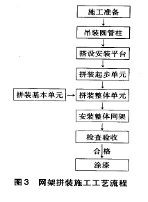 (4)网架的整体拼装 拼完单元锥体之后即可进行整体网架的组拼。首先按照设计要求安装下弦节点,再安装水平杆件,调整无误后拧紧螺栓。安装下弦节点球时,为了防止网架下垂,应先在下弦节点球处搭设临时支撑架,对于有起拱的位置其临时支撑架顶面应符合设计标高要求。安装完下弦杆件即可安装上弦杆件,利用已经拼装好的单元锥体进行拼装,最后再安装斜杆,经调整无误后拧紧螺栓,这样就拼出一个完整的整体单元了。之后以此类推,拼出整体网架。拼装过程中应随时校正尺寸,确认符合设计要求后方可进行下一整体单元的安装。 网架拼装施工工艺流程如图3所示。