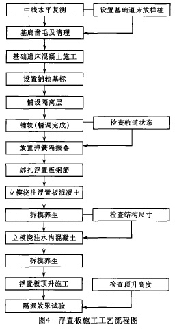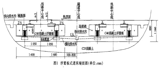 城市轨道连续一现浇一金属弹簧隔振器式浮置板道床施工工艺探讨摘要:本文通过对深圳地铁一期工程单洞双线马蹄形隧道内,连续一现浇一金属弹簧隔振器式浮置板道床施工工艺的阐述,同时综合国内外地铁浮置板式道床施工工艺特点,总结出一定的经验和认识,以供类似工程施工借鉴。关键词:弹簧隔振器浮置板工艺1引言 随着社会发展和科技进步,各大城市对城市轨道发展均做了远期规划,城市轨道的建设也相继开始。为了减少对轨道上部或周围物业的干扰,在特殊区段设置减振道床是地铁设计中的一项重要措施。 深圳地铁一期工程4号线市一少区间,在单洞双线马蹄形隧道内设置了253.87 m连续一现浇一金属弹簧隔振器式浮置板道床。单线共7块标准浮置板,2块过渡浮置板,每块板长28.17 m,宽3.2 m,轨底板厚0.6 m。该段标准浮置板的无载竖向固有频率为5.6Hz,对频率在7.92 Hz以上的振动提供了较好的隔离效果。2基本原理 浮置板轨道又称质量一弹簧系统。这种轨道的基本原理是在轨道上部建筑和基础之间插人一个固有频率很低的线性谐振器,防止由钢轨传来的振动透人基础。 本文所述的浮置板轨道隔振系统为弹簧阻尼集成隔振系统,主要是利用弹簧隔振器将轨道道床与周围结构全部隔离开;钢轨通过弹条扣件与短轨枕连接,短轨枕与浮置板浇注成整体而构成浮置板道床的轨道板。轨道板通过弹簧隔振器支承在基础道床上,轨道板可以提供足够的惯性质量来平衡车辆产生的动荷载,只有静荷载和少量的动荷载会通过弹簧隔振器传到基础道床上。弹簧隔振器的支座部分即是弹簧隔振器的套筒,施工中将其预埋在轨道板内形成整体。轨道板间采用活动连接销使各板连接。3工程特点 3.1弹簧隔振器是该类型浮置板结构的重要组成部分;其疲劳寿命长,容易维护、调整,可在不影响行车的情况下进行更换,是隔振系统中技术先进、隔振效果最好、成熟的方法,国内尚未开发。 3.2在基础道床上需进行预处理;铺设隔离层(铺设塑料薄膜),将轨道板与基础道床隔离开。后续各工序均在隔离层上施工。若隔离层破坏将使现浇轨道板与基础道床连接,造成无法顶升的严重后果,因此施工中对隔离层的保护尤为重要。 3.3轨道板在轨排铺设完成后现浇施工;弹簧隔振器套筒、连接销预埋定位要严格控制。同时,在轨排支撑架设计时要重点考虑轨底与浮置板顶层钢筋间的净空,并充分利用。 3.4浮置板道床与普通短轨枕式整体道床衔接时,为减小刚度突变产生的应力而设计了过渡浮置板,在衔接端增加了弹簧隔振器的数量。 3.5轨道板与基础道床间的弹性间隙小,轨道板顶升采用专用的便携式液压千斤顶压人弹性体,使轨道板缓慢提升。4操作要点4.1浮置板轨道建筑高度构成 轨道建筑高度为880 mm,其中钢轨与垫板高210 mm,短轨枕露出浮置板板面30 mm,轨底处浮置板厚600 mm,轨道板底与基础道床间的抬高弹性间隙为40 mm。浮置板轨道端面见图1。