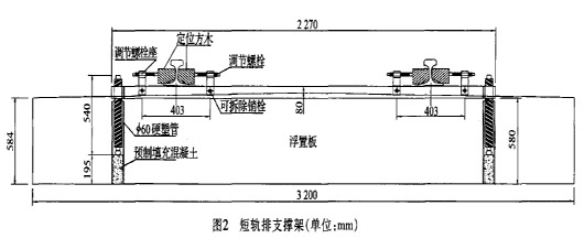 4.2基础道床(隧底回填混凝土)施工 施工前对基底进行凿毛处理,基础道床与衬砌混凝土连接成整体。基础道床分块浇注,其分块一般以纵、横向排水沟为依据。由于铺轨基标设置在基础道床上,待基础道床完成后方可测设,因此需在纵向水沟内设置基础道床施工放样控制桩。基础道床的标高控制尤为重要,为控制保证弹簧隔振器高度,其顶面标高误差为±02mm。施工前在四角设标高点作为大面平整依据,混凝土初凝前在弹簧隔振器中心位置设标高控制桩作为最后精平的依据。 隔离层厚度在2 mm以内,不宜太薄。铺设时在一块浮置板下接头不宜过多,接头处采用透明胶带粘合。4.3轨排铺设 铺轨基标是轨道状态调整的依据,其距轨道中心的距离应根据轨道板的宽度,并考虑模板带木范围等后确定。轨排铺设可分为人工就位架设和组装成排后吊运铺设两种,前者在钢筋绑扎前施工,其所用机具较少,但钢筋绑扎操作空间小,施工进度相对较慢,适用于操作空间小、无法铺设吊运设备轨道或装吊机械无法到达的地段;后者可在钢筋绑扎后施工,钢筋施工操作空间较大,需用到装吊机具,同时钢筋间距及预留的轨枕位置准确度较高,施工进度快,适用于可进行装吊操作的地段。 轨排支撑架是轨排架设和状态调整的基础,普通道床地段的轨排支撑架主要由横梁、螺柱支腿(可调整高度)、承轨槽(设轨底坡可左右滑动)、承轨槽两端调整螺栓等几部分组成。浮置板轨道轨排支承架的设计思路主要为:沿轨排纵向均匀分布,其间距在保证有足够的强度和刚度前提下确定。横梁的高度要充分考虑轨下净空,并考虑拆除承轨槽用4 mm垫板设置轨底坡来增加横梁高度。同时,考虑到在横梁下混凝土内留槽和拆除钢轨的方式来拆除轨排支撑架。轨排支撑架的长度若超出轨道板宽度将会对侧模高度产生影响,可考虑将横梁设计成V字形来避免,但需特殊加工。推荐使用普通道床用的长2 270 mm轨排支撑架,将螺柱支腿套人硬塑管(壁厚5 mm左右)埋置在混凝土内,若支腿高度不够可在硬塑管底预制混凝土柱,并将调整螺栓加高后设置在轨腰处。轨排支撑架设计如图2所示。