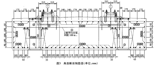 轨排架设到位后,依据基标利用直角道尺调整轨道状态,并精调到位。4.4钢筋施工 钢筋施工前将弹簧隔振器定位后用树脂胶粘接在隔离层上,同时复核弹簧隔振器顶面的标高。 该种浮置板道床的钢筋部分由国外设计,引进的施工图纸中钢筋间距并未做标注,只有钢筋的数量和图示的位置。现场工程师需依据板中心、短轨枕中心、弹簧隔振器中心对称布置的原则确定主筋和箍筋的间距位置,以便指导施工。典型断面钢筋如图3所示。