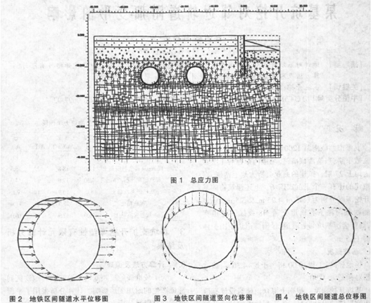 3 基坑支扩开挖弹塑性有限元计算分析及结果[1~3]3.1 计算方法及原理 为了较准确的反映基坑开挖卸载对地铁区间隧道产生的附加变形影响,计算分析采用了平面弹塑性有限元分析方法,以便模拟基坑围护体系与土体间的相互作用,土体自身的弹塑性特点,以及实际开挖工程等非线性因素。以距隧道最近处的基坑剖面为计算结果来评估附加影响。 建模范围为基坑及周围约 50 m 空间范围内的土体,根据以往工程经验和实测数据,以及工程的规模,范围已基本满足模拟土体的半无限体特性。 土体采用 Mohr- Coulomb(M- C)材料模式来模拟,Mohr- Coulomb 材料模式可较好的模拟土体的弹塑性及相关特性。 围护体及隧道均通过输入等效的 EA 及 n 等参数来模拟其力学特性。通过输入合理的接触面参数来模拟结构物与土体的接触非线性。计算中考虑了地下水的渗流影响,考虑了土体初始固结沉降及初始应力的影响。通过分荷载步求解来模拟施工工程。计算模型的网格划分为六节点三角形单元。部分计算参数由以往大量同类工程实测数据反分析求得。3.2 计算模型及计算结果 总应力图、地铁间隧道水平位移图、地铁区间隧道竖向位数图、地铁区间隧道总位移图,如图1、2、3、4 所示。