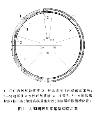 选择丙烯酸盐浆液作为壁后防水帷幕的材料主要有以下原因: ①低粘度、穿透性好、防渗性能佳; ②浆液凝胶时间可以控制、调整; ③可与流砂形成固结体, 达到良好的固砂效果; ④相对于类似注浆液如丙烯酰胺等具有低毒、环保的特性。 具体注浆要求如下: ①注浆范围: 上、下行线与中间风井相接的进洞处各 20 环范围。②注浆顺序: 先底部、后两侧, 逐渐向上。③注浆控制标准: a.衬砌收敛变形达 2 mm 或轴线偏差达 10 mm; b.注浆总量相当于在衬砌外围达到 15 mm 厚的凝胶体 ( 均值); c.注浆压力达到 0.4 MPa。上述标准达到任何一条即认为达到注浆终止要求。 2)壁后注浆结束后, 应对仍有渗漏的衬砌环、纵缝, 在嵌缝槽处埋设注浆管, 压注丙烯酸盐浆液。 ①对无渗漏的嵌缝槽应采用嵌填水膨胀密封胶(挤出型)加封高模量密封胶的方法做嵌缝处理, 处理范围为上、下行线与中间风井相接的进洞处各 20 环。若衬砌接缝存在错缝, 嵌填密封的密封胶厚度可做相应变化, 但高模量密封胶的厚度应≥10 mm。此举的目的在于防止地下水因衬砌内侧进行局部注浆时, 从原先无漏点的接缝中产生渗水。 ②漏点的封缝材料应采用超早强、快硬水泥, 快硬水泥抗压强度应达到 14 MPa(4 h 之内), 封缝范围以半环为宜, 注浆压力控制在 0.05 ̄0.3 MPa。 3)在干燥或基面仅有湿渍条件下, 对管片内表面裂缝做骑缝压注亲水性低粘度环氧浆液的补强堵漏处理, 具体注浆方法为采用粘贴式注浆嘴粘合于缝上或凿小槽封埋于骑缝位置, 为了对准缝隙可用针插入缝隙 ( 也称针眼法注浆)。注浆孔间距为 200 ̄250mm, 注浆压力控制在 0.1 ̄0.5 MPa, 注浆前先采用环氧胶泥( 或专用密封胶) 刮涂密封裂缝, 环氧胶泥( 或专用密封胶)应为可粘合于潮湿基面的材料。上述补强堵漏措施同时为后续的碳纤维加固工作提供了必要的前提条件。