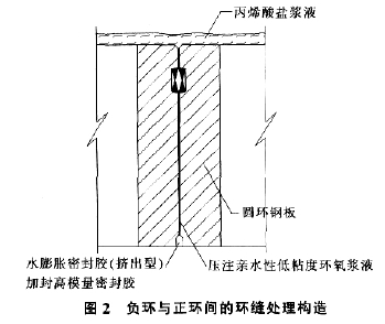 3.4 钢圈布置措施 在衬砌注浆堵漏、管片碎裂修补工作结束后, 考虑到隧道的整体耐久性要求, 设计人员针对上、下行线进洞处约 20 环衬砌内局部破损严重处以及衬砌负环与正环间的接头薄弱处, 提出了增设圆环钢板的方案(见图 2 所示)。 设置的圆环钢板既要达到增加衬砌整体性、可靠性的目的, 又要尽量减轻钢板的重量, 以利于安装使用。因此我们选择了厚度为 20 mm 的钢板, 采用化学锚栓环向固定于衬砌内表面的方式; 钢环通过现场测量放样后加工, 以保证它与衬砌内壁的贴合。 为使钢圈与衬砌之间形成一个整体结构, 故在两者之间压注亲水性低粘度环氧浆液。每个钢圈两端在压浆前应先用专用密封胶作封堵密闭处理, 钢圈顶部及底部应预设压注环氧树脂的进浆孔、出浆孔( 包括观察孔、备用注入孔)。 钢圈暴露面涂布环氧富锌底漆(20 μm 厚) 和无溶剂超厚膜型环氧涂料(1 100 μm 厚) 以保证其耐久性要求。4 结语 本工程堵漏修复工作现已全部结束, 根据现场检查情况来看, 基本达到了设计方提出的修复要求。该工程中的堵漏、修复方案, 可为今后盾构隧道遇到的类似工况, 提供制定方案的参考依据。