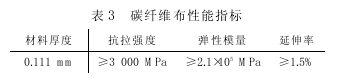 3)管片修补完毕后, 在修补面铺设碳纤维布做加固处理, 以提高管片修复处的整体强度。加固粘贴的碳纤维布层数按照足够的安全系数考虑, 粘贴 3 层。碳纤维布应符合如下性能指标要求(见表 3 所示)。