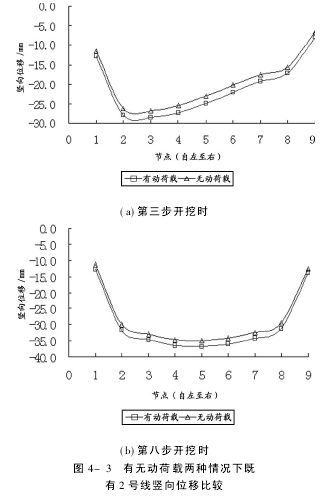 此外,随着隧道开挖的进行,在既有地铁2号线道床位置中心点处,其竖向位移的变化也能反映应力释放率对既有轨道2号线的影响.如果在整个施工中应力释放率不变的话,随着开挖步的进行,应力释放率的作用会越来越明显,即同一位置各施工步的竖向位移差会随施工步的进行逐渐增加(如图4-2所示).4.2 有无动荷载的比较 与其他地下管线不同,既有轨道线路在其他隧道开挖时,会时不时地有地铁通过.所以,有必要来分析,在其他隧道开挖时动荷载对既有轨道线路是否有影响,且有多大影响.鉴于此,依然采用上面的三维有限元模型来分析动荷载的影响. 根据《地铁设计规范》,上海地区轻轨车辆轴重为110kN,同时考虑到2号线运营时的振动影响还必须考虑动力系数,《规范》中规定对于地铁和轻轨的动力系数按铁路桥规公式计算后乘以0.8的系数.另外,在有无动荷载两种情况中均考虑不利情况,取50%的应力释放率. 计算结果表明:与无动荷载的情况相比,考虑动荷载后,地铁2号线最大沉降值为36.08mm,仅仅增加了1.01mm. 为了更为直观反映,在新隧道施工期间,列车动荷载作用的影响,将有无列车动荷载两种情况下既有线的沉降曲线做一个对比,如图4-3(a)~(b)所示: 从图4-3可以看出,由于动荷载的作用,每一步开挖中既有地铁2号线竖向位移略有增加,但是其影响效果不明显,基本上可以忽略不计.