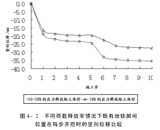 从图中可以看出,在不同应力释放率情况下,尽管每一步开挖中既有地铁2号线竖向位移的变形趋势都是相同的,(即开挖隧道中线与既有线中线叠交位置处容易发生较大沉降),但是,如果施工中管片周围土体吸收的释放应力越大,则既有地铁2号线的竖向位移就会越大,而且叠交位置两侧的位移差也会增加.也就是说,由于土体超挖、不及时施作管片和注浆未紧跟等因素造成的过大应力释放率,易于使既有线路产生不均匀沉降,甚至是失稳破坏.