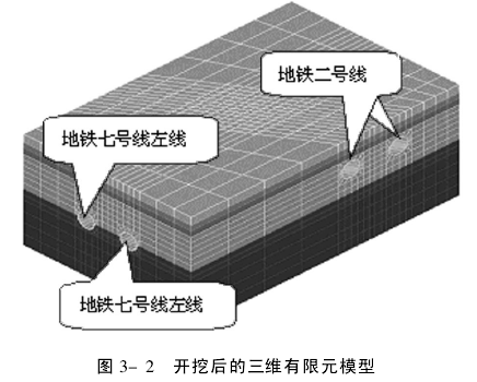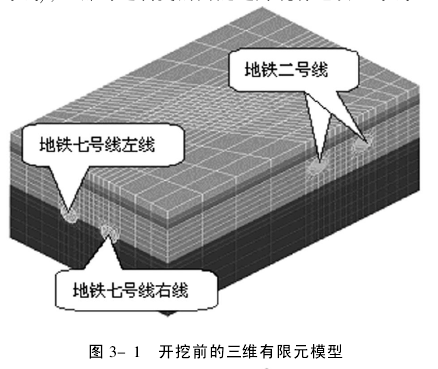 3 三维有限元模型 有限元模型尺寸长96m、宽60m、高40m,经过优化后的有限元网格如图3-1、3-2所示,共有10744个单元.下部两隧道为开挖的下穿隧道(地铁七号线),上部与之斜交的两隧道为既有地铁2号线. 由于盾构隧道开挖是分步进行,所以本计算中模拟的开挖步是:隧道开挖时前五步开挖左线后五步开挖右线.第一步时,七号线左侧隧道的掘进面距离地铁二号线下方2m;第二步时,七号线左侧隧道的掘进面到达地铁二号线的侧下方;第三步时,七号线左侧隧道的掘进面通过地铁二号线的正下方;第四步时,七号线左侧隧道的掘进面完全通过地铁二号线的下方;第五步时,七号线左侧隧道完成地铁二号线地段的开挖;第六步至第十步是重复上述五步对地铁七号线右侧隧道进行开挖.