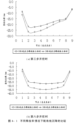4 数值模拟结果分析4.1 不同应力释放率的比较 由于施工中管片的施作往往不够及时,或者是由于注浆未能同步进行,所以在开挖隧道时一部分被释放的应力是作用在周围土体上的,这样管片周围土体就会在管片拼装完成前发生较大变形,从而影响既有地下铁道的安全.鉴于这种情况,首先分析不同应力释放率对既有地下线路位移的影响.在此, 比较两种情况,即:当有30%和50%的应力释放到管片周围土体时,分析既有地下线路位移的不同变化.这主要是因为30%的应力释放率是盾构施工的基本要求[4],这时管片的施作和注浆基本能及时紧跟.而50%的应力释放率是盾构施工的不利情况,这时管片施作和注浆不及时,地层损失较正常施工大,所以需要比较分析在这两种应力释放率情况下既有地铁线路的位移变化规律. 通过计算得到,当有30%被释放的应力作用在管片周围土体时,既有地铁最大沉降值为27.40mm,而如果50%被释放的应力作用在管片周围土体时,既有地铁的最大沉降值增至35.07mm.为了方便说明问题,在道床位置沿着既有地下线路的纵向距离叠交中心位置处各27.8m范围内,取出一组点,来分析该组点的竖向位移变化情况. 图4-1(a)~(b),比较了不同应力释放率情况下,地铁2号线在地铁7号线第三和第八模拟开挖步时的沉降曲线.