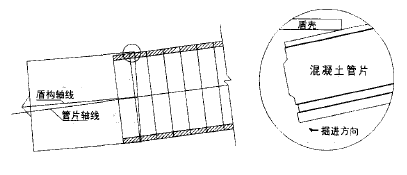 2.4盾构机姿态控制与线路曲线段不匹配 管片是在盾构机尾部内进行拼装,拼装完成后隧道管片在盾构机内部的长度约为2.3m管片外侧的空隙为5cm,盾构机在曲线段掘进时盾构机的姿态变化与管片的姿态变化不一致,盾尾密封刷挤压管片造成开裂(见图5)。