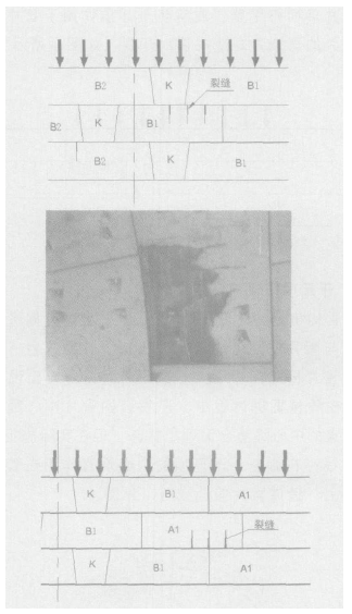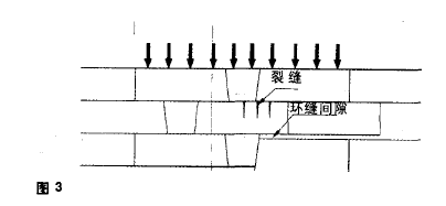 1.2后开裂 裂缝从管片后端开裂并向前延伸(见图2),此类裂缝主要在隧道的两腰部位或偏上位置。2管片开裂的原因分析 盾构隧道管片为钢筋混凝土结构其开裂主要为受力不均或受力过大所造成。在施工过程中,管片的受力状态与设计所考虑的不完全一致盾构机掘进过程中管片承受着千斤顶顶力盾尾密封刷的作用力和衬砌背后注浆的浆液压力等在这些荷载的相互作用下使盾构管片出现了不同的受力特征。通过对现场观察了解结合其它地铁工程中的经验造成管片出现上面开裂现象的主要原因可能有如下几种:2 .1盾构机千斤顶总推力较大 作用于管片上的力是造成管片开裂的最基本因素其中盾构推进过程中总推力过大是致使管片开裂的最直接原因。目前,国内地铁盾构隧道施工中,淤泥质粘土层中总推力为8000 ~12000kN;细砂土地层中总推力为12000 ~15000kN,当总推力过大时,对于养护不好并且配筋小的管片则有可能开裂。2 .2管片环面不平整 造成管片环面不平整主要有:管片制作精度误差管片纠偏时贴片不平整;盾构机推进时各区的千斤顶推力大小不等管片之间的环缝压缩量不一致等原因。因管片环面不平整盾构机千斤项作用于管片上将产生较大的劈裂力矩造成管片开裂(如图3所示)。