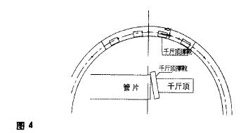 2 .3千斤顶撑靴损坏或重心偏位 盾构机通过千斤顶作用于管片上向前掘进.在千斤顶与管片接触处设置撑靴以减少管片压力,撑靴损坏后管片局部压力增大造成管片损坏或出现裂缝。 在盾构掘进过程中已拼装的管片中心线与盾构机本身的中心线重合为理想状态但在实际施工中两条轴线存在偏差千斤顶的中心没有作用在管片环的中心上,造成管片偏心受压(见图4)。