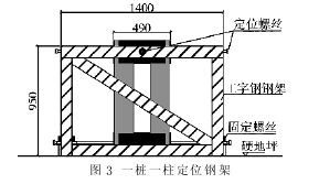 4 立柱垂直度控制 立柱垂直度的偏差控制, 是逆作法施工的技术难点之一。根据当前的工程实践, 控制立柱垂直度偏差的有效方法就是利用特制的定位纠偏架。定位纠偏架采用高强膨胀螺栓固定于硬地坪上, 利用测量仪器可将架体的中心与桩位中心重合; 利用架体下端螺栓可将立柱位置( 包括中心位置与平面转动) 准确固定; 利用架体上部的千斤顶校正立柱垂直度( 图 3) 。