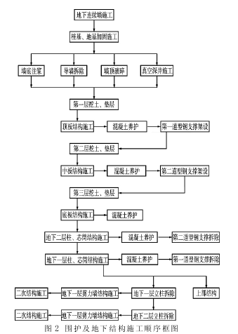 3 技术准备与部署3.1 逆作法施工的设计特点 逆作法施工需要设计与施工的紧密结合。根据目前的工程实践, 逆作法施工适用于: ( 1) 坑面积大、深度深, 周围环境复杂, 对变形要求较严格; ( 2) 结构形式尽可能为框架结构, 并尽可能地减少剪力墙部位的逆作施工; (3) 地下室层高较高, 柱网较规则且柱距较大, 如采用全逆作法施工, 则首层层高也应较高( 以便出土机械、车辆作业施工) ; ( 4) 从顶板往下各层楼板的标高、梁高应尽可能统一、规则, 有可能的话可设计成无梁楼盖, 以减少同层挖土中的标高差; ( 5) 柱下布有工程桩, 且尽可能布置“一柱一桩”型竖向临时立柱, 以减少坑内立柱数量, 当桩的设计承载力较大时,可设计成大口径桩以提高单桩承载力, 柱截面尺寸应偏大,尽可能采用“宽柱窄梁”; ( 6) 结构顶板上应布置有重载区域, 以便重型施工机械及车辆停放、行走。3.2 本工程设计状况 由于本工程地下结构存在 3 家设计单位 ( 主体设计、围护设计及人防设计) 平行分包设计, 且过程中缺乏必要的协调和结合; 而且原先的主体设计在方案阶段直至施工图阶段, 全部按顺作考虑, 根本没有考虑到逆作法的设计特点。这主要表现在以下几点: ( 1) 地下室层高偏低, 挖土净空高度较小; ( 2) 柱网不够规则, 且柱距偏小, 围护设计在布置临时立柱时, 抽掉了一部分柱而没有布置临时立柱, 使结构柱网在地下结构施工工况下与正常使用工况下不同, 要求对结构梁、板根据施工工况进行复算; ( 3) 板、中楼板标高太多, 且梁高不一; ( 4) 大多数柱下无桩, 只能采用“一柱二桩”“、一柱三桩”型, 使基坑内立柱大量增多, 桩间托梁使结构梁、柱节点变得更为复杂, 且柱截面尺寸普遍偏小, 而梁受层高限制做得较宽, 成为“窄柱宽梁”型; ( 5) 原主体设计单位对取土口周边梁、顶板重载区域等设计需与围护设计单位、施工单位结合并优化。3.3 技术准备与部署 根据本工程半逆作法施工的具体情况, 我们在施工前作了下述技术准备与部署: ( 1) 据现场车辆行走条件及出土、施工等需要, 确定重载区域和楼面荷载, 提交设计单位进行验算; ( 2) 对取土口周边梁按围护结构圈梁要求进行验算和优化; ( 3) 对梁板水平传力体系进行验算和优化, 特别是楼板标高变化处, 防止梁、立柱在水平力传递过程中受扭或受剪破坏; ( 4) 由于本工程立柱较多, 对立柱布置进行优化, 使之尽可能方便土方开挖; ( 5) 对“一柱一桩”型结构柱截面作优化, 使临时立柱在合理偏差下能包含于柱中; ( 6) 对原“一柱二桩”、“一柱三桩”立柱间的托梁设计进行优化, 使框架节点尽可能地简单化; ( 7) 由于本工程施工工况与正常使用工况的结构柱网存在差异, 故需对施工工况下的结构梁、板进行全面验算; ( 8) 对梁、柱节点的钢筋布置, 进行深化、翻样。 ( 9) 在全面理解围护设计半逆作法施工设计意图的基础上, 对本工程围护及地下结构施工顺序作全面部署, 见图2。