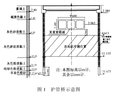 套管法拔桩施工对邻近箱涵的影响分析摘 要 在地铁施工中难免遇到侵入开挖限界的桩基础,一般的处理方法多是对其进行拔除,但在施工过程中必须将对周围管线和建筑的影响降低到最低限度。结合上海软土地层中的一个拔桩工程实例,通过实测数据分析后认为,采用套管法拔桩对邻近箱涵的沉降影响在允许范围之内。其经验可供类似工程借鉴。关键词 地铁施工,拔桩,箱涵沉降 城市地铁选线的一个重要原则就是其走向尽量沿城市主干道,以避开高层建筑的桩基。但由于城内建筑物林立、河道纵横、主干道上桥梁众多,在地铁隧道盾构推进施工中,难免遇到中高层建筑、防汛墙和桥梁的桩基侵入隧道开挖限界的情况。为使盾构顺利推进.就需要将这些侵入限界的桩拔除[1]。 拔桩施工最重要的是破除桩周的摩阻力,主要为切断桩基与外界土体的联系,减少拔桩力。此施工多采用套管法。一般套管打设主要采用钻进套取法和冲击成孔法。对于上海所特有的淤泥质地层,多采用振动锤进行冲击成孔,破除桩基周围土体的包裹,随后采用油压千斤顶将桩体在预定位置拔断。 在桩体拔出过程中,难免对于周边的土体产生扰动,甚至会威胁到一些重要建筑物的安全。由于原桩基施工质量存在着差异,因此拔桩施工存在着相当大的不确定性。必须加强施工中对周围环境的监测,并根据监测结果调整施工参数,保证周边结构物的安全。 本文主要介绍拔出护管桥桩基的一个工程实例。施工过程中对邻近桩基的一重要箱涵———原水管渠进行了监测,通过监测数据分析了拔桩过程对箱涵的影响。1 工程概况 上海轨道交通线6号线双圆盾构某区间隧道,在两条城市主干道交叉口的一个重要箱涵下方穿越[1]。此箱涵为宽9.6m、高3.14m的3孔无压过水箱涵,每25m设一个伸缩缝。为保护此箱涵安全,原主干道上已构筑了护管桥(见图1)。护管桥基础为两排?800mm的钻孔灌注桩,桩深36m,两排桥桩与隧道轴线夹角为83°。盾构穿越断面每排各有5根灌注桩侵入隧道限界。为此在盾构掘进前需对10根桥桩进行拔除施工,以确保盾构施工的正常进行。桩体边线距离箱涵边线为5.065m,10根待拔桩的具体位置及编号参见文献[1]的图1。