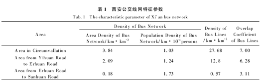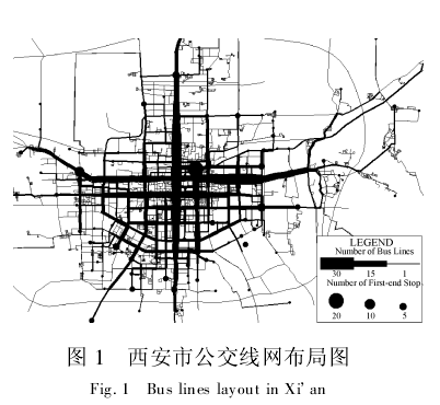 1 西安城市公共交通现状 (1) 线网布局 目前西安市有公交线路159条,营运线路总长度3141km.公交线网基本上是以老城区钟楼为中心,以50年代的工业区、商业网点、文化教育、娱乐中心等布局为依托,形成现今的以明城墙区为中心,由城内向城外的辐射形,如图1所示.由于受城市布局和棋盘状路网格局的限制,西安市公交线网布局情况表现为“三多三少”,即旧城区线路多,城郊区线路少,线路东西走向多,南北走向少,南半区走向多,北半区走向少.且整体公交线路分布疏密不均,二环路以内区域公交线网密度明显偏高,二环路以外区域较为稀疏,具体公交线网特征参数见表1.