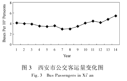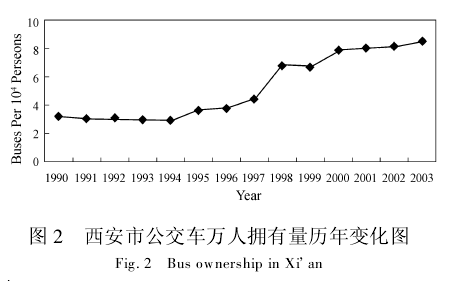 西安市公交线路主要集中在明城墙区、太乙路地区、文艺路地区、东关地区、南关地区、太白路地区、劳动南路地区、红庙坡地区、北关地区、胡家庙地区、小寨地区等11个地区,其他地区公交网密度较小.即使在公交线网密度较大的这11个地区内,由于线路重复系数大,线路相对集中,实际覆盖面并不大,从而也体现了线路布局不够合理.按照《城市道路交通规划设计规范》要求:在中心市区公交线网密度应达到3—4km/km2,在城市边缘区公交线网密度应达到2—2.5km/km2,与之相比,西安城市公交线网密度整体偏低. (2)公交车拥有量分析 公交车拥有量是表明公交运力的重要指标.目前西安市营运公交车辆共3736辆,是1995年的3.82倍,公交车万人拥有量历年变化情况见图2所示.1990年以来,西安市万人拥有公交车辆数总体上呈大幅增长趋势,其中1990—1994年增长速度平缓,偶有下降,1994年以后增长幅度加大,到2003年底市区万人拥有公交车标台数达到了8.55.但按照《城市道路交通规划设计规范》要求,西安市万人公交车拥有量应为10—12.5标台,西安市仍比标准低1.45—3.95个标台左右。 (3)公交客运量变化情况 西安历年公交客运量演变见图3.1990—1996年间客运量呈下降趋势,这主要是由于这一时期出租车辆数增长较大,由1990年的3721辆增至1997年的10044辆,出租车吸引了一部分客流,致使公交客运量呈下降趋势;1997—2000年间公交客运量逐渐增加,截止2003年为5.45亿人次.在此期间,一方面是对出租车数量的增长作了适当的限制;另一方面公交公司通过加大投入,改善服务,使公交客运量逐年增加.由以上分析可以看出,增强公交的竞争能力,除了要增加公交的便利、舒适程度,还要依靠有利于公交发展的政策和管理措施的支持. (4)公交出行者特性分析 西安市公交服务的主要对象是工人、学生、专业技术人员、商业、服务业人员、离退休人员,这五者占公交乘客的80.12%.也就是说,公交服务的对象主要是工薪阶层,同时,也说明目前居民出行选择交通方式考虑的主要方面之一就是出行费用.因此公共交通吸引较多客源的又一主要手段便是合理的票价和舒适的乘车环境.西安市居民乘坐公交的主要出行目的是工作、购物和回程,三者占公交出行的79.03%.[1] (5)公交客流空间分布 西安市公交客流走廊明显,基本呈“四横、三纵、半环”分布,在解放路、东西大街、长安南路及南、北大街形成高断面公交客流,日平均客运量均超过17万人次,具体断面流量如图4所示.从图中可以看出,西安市公交客流很明显集中于有限的几条道路上.2 西安公共交通面临的危机和压力2.1 西安公共交通目前存在的主要问题 通过以上对西安城市公共交通现状的分析,可以看到西安城市公共交通已具有一定规模,并且为西安社会经济的建设与发展做出了贡献,但仍存在一些问题,从而消弱了公交的优势: (1)公共交通出行时间过长,降低了吸引力.市区内各线路的运营速度偏低,中心区各线路的运营速度大都在10km/h左右,交叉口延误时间长,公交车准点率低,这些严重影响了居民的出行效率[2].目前,西安公交出行时耗较大,其中公交出行中时耗大于30min的占75.3%.由此可见,提高公共交通运转效率,减少公共交通换乘时间,是提高公共交通吸引力的首要前提. (2)公交线网布局不合理.公交线网密度整体水平偏低,中心市区线路重复较多,城市二环线以外公交线路明显偏少,城市居民接近公交的程度不高;另一方面,乘客的集散、换乘都集中在古城区一些大交通枢纽和集散点,造成市中心区交通堵塞、拥挤,而出城后则客流迅速减少. (3)公交优先政策和管理措施不强.目前西安还没有比较成型的倾向于公交发展的政策和管理措施出台,还未能形成从上至下的大力发展城市公共交通的外部环境.2.2 西安公共交通面临的压力 随着城市的进一步发展,交通需求激增,而西安本不完善的城市公共交通将面临更大的危机和压力,这主要来源以下几个方面: (1)城市规模的扩大.根据西安市第四次城市总体规划:2010年西安市域总人口规模为955万人,其中主城区人口规模为525万人,用地规模525km2.2020年西安市域总人口规模为1030万人,其中主城区人口规模为600万人,用地规模600km2[3].未来西安市城市规模急剧扩大,一方面使中心区得到疏解;另一方面城市空间的拓展也必然使居民出行距离增长.出行距离的增长导致自行车、步行出行方式的适用性下降,机动化出行方式的使用需求大大增加,这就需要通过发展公共交通引导交通方式合理转化为公共交通方式出行,避免过多地转化为小汽车方式出行. (2)出行量迅速增大.出行是由人产生的,随着城市人口的膨胀和社会经济的发展,城市居民出行总规模一直在攀升.居民出行调查显示,2000年西安市区居民日出行总量为711万人次左右.笔者在参与西安市城市快速轨道交通线网规划时利用出行强度和人口数量对西安主城区出行总量进行了预测,预测时对常住人口和流动人口进行分别考虑,对周边城镇的居民出行与主城区的居民出行区别对待,此外还考虑周边城镇居民进入主城区的出行量和对外交通枢纽产生的客流量.预计,西安主城区出行总量2010年为1292万人次/日,2020年为1826万人次/日[4]. (3)私人机动车增长很快,对公交冲击很大.近十年来,西安市区机动车拥有量年平均增长率为10.80%,其中小客车年平均增长率为14.13%.私人机动车的急速增长,对城市公共