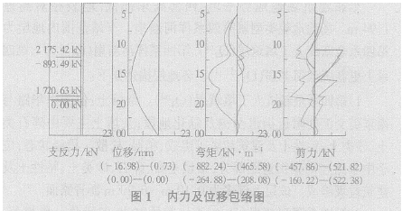 3.4 南京街站基坑围护方案 1)方案简介。根据上述分析,南京街站主体标准段采用Φ1000@1300mm钻孔灌注桩,桩长为23.0m,桩底穿透粉质粘土层,插入中、粗砂层或砾砂层中。端头井段采用Φ1000@1300mm钻孔灌注桩,桩长为26.0m,桩底穿透粉质粘土层,插入砾砂层中。横撑采用Φ600钢管,壁厚t为14mm,16mm,横撑水平间距一般为3.5m左右,横撑布置应避开主体结构立柱。标准段竖向采用三道支撑,盾构井处竖向采用四道支撑。 2)计算软件。本设计采用北京理正软件设计研究院的深基坑软件(V5.22)进行计算。 3)荷载及组合。a.永久荷载。结构自重按实际重量计算,钢筋混凝土重度按25kN/m3计; 侧压力除砂层按水土分算外,其他粘性土层均按水土合算;静水压力采用全水头(勘探期间的稳定高水位)进行计算。 b.可变荷载。施工期间基坑侧面超载一般按20kPa计,盾构端头井侧面超载按30kPa计。 4)计算结果。支撑及钻孔灌注桩内力及位移包络图如图1所示。根据上面计算结果看,标准段围护结构最大水平位移为17.63mm,最大设计轴力分别为:第一道539.27kN,第二道2575.64kN,第三道2252.88kN。端头井处围护结构最大水平位移为19.65mm,最大设计轴力分别为:第一道359.06kN,第二道2390.74kN,第三道2574.69kN,第四道1609.21kN,当拆除第三道支撑时,应进行支撑倒换,换撑设计轴力为2052.78kN。经验算,围护结构满足强度、整体稳定性和变形等要求。4 结语 从上述分析可以看出,在沈阳地区用明挖法修建地铁时,只要设计参数得当,采用钻孔灌注桩与钢管支撑联合作用的围护结构形式是比较可行的。参考文献:[1]GB50157-2003,地铁设计规范[S].[2]GB50010-2002,混凝土结构设计规范[S].[3]JGJ120-99,建筑基坑支护技术规程[S].[4]GB50007-2002,建筑地基基础设计规范[S].[5]JGJ79-2002,建筑地基处理技术规范[S].