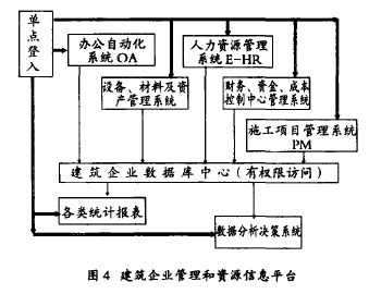 如果外省市一个工程一年中的重大节点或事件数量还要多,那么就这一项费用一年就可为公司节省相当大成本开支,而在信息流的收集、数据流的生成方面,更是有着不可估量的信息财富来源。4 应用中存在的问题 虽然在试点过程中通过项目积极配合,参与人员共同努力,取得了一定的效果,但是在这次远程文件传送的课题研究中,还发现一些问题。 (1)工程项目施工管理传统工作模式较根深蒂固,对现代化的工作模式还不能完全适应。 (2)施工管理的一些人员还把工程技术信息当成个人的“私有财产”,不愿意提供重要技术信息(或技术数据)、管理信息,因此所形成的信息流有断层、不完整现象。 (3)建筑企业目前项目信息化管理还处于摸索阶段,还没有形成系统的相关管理制度去指导和规范项目信息化管理工作。 (4)工程项目施工信息人员的计算机及应用操作水平参差不齐,这也影响实施现代化管理的进程。5 今后的目标 建筑企业的信息化、数据化工作是一项长期的战略性的系统工程,是一项企业资源不断优化的工程。企业信息化与管理过程密切相对应,企业的信息化系统、数据库模型不是一陈不便的,它应随企业管理模式的变动和优化而相应地不断完善和优化。 进人二十世纪九十年代,美国、西欧等一些发达国家,其信息产业占国民生产总值比例相当高,而网络技术的水平也代表一个国家信息化水平的高低。同样,一个企业在远程(互联网)、近程(局域网)的应用水平也代表它在信息化、数据化管理水平的高低,直接反映一个企业的综合能力,更决定一个企业在资源优化、成本控制上的优劣。 通过远程传送应用,施工企业的领导管理层已充分认识到信息化发展对企业提高在市场经济中竞争力的重要性和迫切性。从建筑企业长远发展来看,信息化工作应该将简单信息流的量的积累转化为数据流形成、后期数据分析的质的提升。我们要向建立一个集互联网、局域网整合的企业管理及资源优化系统的方向努力,它包含整个施工企业各项管理和资源的信息平台(见图4)。