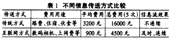 鲁班路一西藏南路区间盾构是采用日本新三菱盾构机进行隧道掘进施工,它较以往地铁施工采用的法国FCB盾构机有一定的区别。这时要求项目部应用互联网技术,借助于“我的工程网”平台在INTERNET上进行现时的、全方位的技术交流,从卷扬机的定位、开口滑轮的位置,到盾构机调头力点的布置、盾构机出洞后座的布置等施工技术要点,通过应用互联网及时得到施工单位相关技术部门的指导,项目部结合现场情况对技术方案进行了科学可行的调整。 按过去传统方式,每当一个重大工程遇到重大节点时,施工公司总部要派公司主要工程技术负责人员到施工现场督阵,帮助协调和解决一些突发事件、技术难题等(特别是地下工程突发和不可预知事件较多),而当几个工程同时遇到重大节点工作时,在主要工程技术负责人员安排上就无分身之术,特别是外省市的工程就更难了,因此外省市重大工程的事件信息来源和处理都是滞后的,有时甚至是人为的信息闭塞,以至给建筑企业带来不可弥补的损失。现在有了高速高效的互联网技术可及时传送多媒体的图象、影像和声音等信息源,这些问题都可以解决。 从另外一个经济成本角度分析,使用传统方式和现代互联网方式也是完全不同的,前者累积费用很高,工程事件越多成本越高;后者虽一次性投人较高(数码相机、上网费等),但工程事件越多成本反而越低。而在信息流传递速度和处理事件的及时性上,后者远远高出前者。现以外地某项目为例作二者比较(一年5个重大节点工作),如表1。