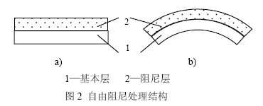 自由阻尼处理是将一层一定厚度的粘弹阻尼材料粘贴于金属基体表面上。当结构产生弯曲振动时,阻尼层随基本结构一起振动,在阻尼层内部产生拉-压变形,如图2b所示。根据阻尼材料的耗能机理,当阻尼材料内部产生交变应力时,阻尼材料就会将有序的机械能转化为无序的热能,从而起到耗能的作用。自由阻尼结构如图3所示。