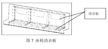 另外,由于车辆连接处是噪声的主要来源,因此必须在贯通道上采取有效的隔音措施,例如采用双层棚布及在贯通道和车钩支承面之间增加耐磨材料等方法有效地降低噪声。为了有效地控制噪声在车辆内部传递,通常在座椅背面贴附消音板(座椅消音板如图7所示),增强座椅等内饰物的吸声效果,降低车辆内部总噪声级。