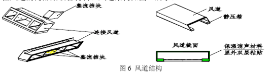 空调系统在调节客室内温度、给乘客创造舒适的环境的同时,气体的流动也产生了噪声。空调系统可采用下面两种方法进行降噪:第一,在空调机组的出风口处增加消音装置;第二、在风道的内部贴吸音材料。风道结构如图6所示。