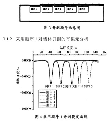 图4给出了采用顺序1开洞时洞口位置的竖向挠度曲线。应当指出的是,该组曲线的挠度已经减去了未开洞口时墙体在恒活荷载作用下的竖向挠度,也即曲线的挠度值均为相对挠度。该组挠度曲线表明采用顺序1开洞时: 新洞口的开凿会加大前面洞口的挠度,增大的幅度约为7.5%。 新增洞口的影响范围仅仅局限于对前一个洞口(例如:洞口3的开凿仅影响洞口2的挠度,而对洞口1的影响甚微)。3.1.3 采用顺序2对墙体开洞的有限元分析 图5是采用顺序2开洞时墙体的最后挠度曲线,与顺序1前文类似,该组曲线亦减去了未开洞口时墙体的竖向挠度,曲线数据也是相对值。该组挠度曲线表明,采用顺序2开洞时: