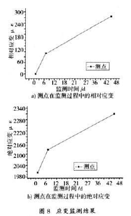 (2)门洞凿除阶段 ①凿除地下连续墙钢筋保护层,割断地下连续墙钢筋。 ②根据门洞宽度确定架设型钢临时顶撑的根数,一般不得少于1根,当门洞宽度大于8 m的,不得少于3根。从上至下由门洞一侧抽条凿除地下连续墙混凝土,抽条宽度1~2 m,在凿除地下连续墙位置中间位置附近架设型钢顶撑。 ③用10 mm厚钢板或8#槽钢焊接地下连续墙主筋,然后用神仙葫芦吊起并安装型钢顶撑,型钢顶撑采用300H型钢,型钢上部1 m由300H型钢调整为300 mm×200 mm。型钢顶撑最上端用钢板与地下连续墙楔紧后将型钢顶撑、钢板、地下墙主筋电焊焊接固定。 ④凿除剩余部分地下连续墙混凝土。 (3)门洞结构施工阶段 ①在门洞四周新老结构相贴处打注水膨胀聚氨酯密封胶,并在门洞地下连续墙中间四周安装全断面出浆注浆管。 ②按设计图纸要求绑扎柱钢筋及门框梁钢筋,并安装门框可卸式止水装置的角铁框。 ③门洞梁柱结构施工。 (4)收尾清理阶段 ①当混凝土达到强度后,拆除门框排架及梁底模并拆除型钢顶撑。 ②安装可卸式止水带,并通过全断面出浆注浆管对门框新老混凝土交接处进行注水泥浆。门洞防水节点图详见图7。 ③恢复老结构门洞处装饰、设施、管线,拆除彩钢板围护。3.3 现场监测 在采用微损开洞施工技术的同时,我们还对门洞周边的地下连续墙进行了现场监测,监测墙体在拆除过程中的变形情况。监测设备采用JDEBJ-2型振弦式混凝土表面应变计并配合数据采集系统进行现场监测。 经有限元初步计算分析表明,洞口开设后沿洞口上方的应变变化最大,为此选定17号门洞作为主要监测对象,在该洞口上方布置了三个测点。 整个监测过程历时45 d,共进行了3次数据采集。图8为17号门洞正上方测点的应变监测情况。 监测结果反映了洞口开设过程中的应变发展情况,即在门洞顶端墙体应变变化最剧烈且以拉应变为主。相对于初始应变状态,该门洞上方墙体的应变随着洞口的开设增大了306.1μe,应变的发展基本呈现为线性发展过程,表明了开洞后洞口上方墙体处于受拉状态,需要在门洞开凿完成后及时施加支撑体系,以防止洞口顶部受载过大引起破坏。这点与微损开洞技术中即时安装型钢顶撑是相吻合的。通过对曲线的分析也表明,采用微损开洞技术造成的应变集中相对较小,对地下连续墙的影响较小,保证了既有车站结构的安全。