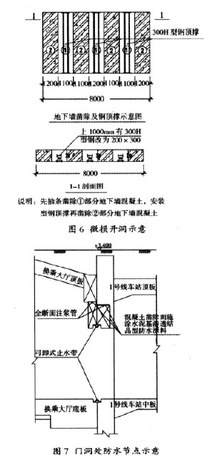 新开洞口会加大既有洞口的挠度值,增大幅度约为7.5%; 新开洞口仅影响上次开凿洞口,但影响方式较顺序1复杂。3.1.4 结论 两种假定的开洞顺序分析表明,两种不同的开洞顺序最终得到的洞口挠度值一致,新开洞口都会加大既有洞口的挠度,影响也仅局限于上一次开凿的洞口,增大幅度约为7.5%。但采用顺序2开凿的影响方式较洞口1复杂,且理论上较实际情况偏小,因此,采用顺序1的方式开洞是最优化方案。3.2 微损开洞施工技术3.2.1 施工工艺流程 抽条凿除老结构地下墙混凝土(型钢顶撑制作)→安装型钢顶撑→凿除剩余老结构地下墙混凝土→安装全断面注浆管→门洞梁、柱钢筋绑扎(止水角铁框制作)→预埋止水角铁框→门洞梁柱支模、浇筑混凝土→门洞梁柱拆模→型钢顶撑拆除→安装可卸式止水带→全断面注浆管注浆。3.2.2 技术方案 (1)准备阶段 ①在地铁1号线、2号线站厅层及联络长通道一侧内将门洞施工范围内的各类既有设施及管线进行搬移,确保门洞处施工范围内无影响施工的物体。 ②待影响施工的设施搬移后,在站厅层一侧进行门洞施工作业点封闭围护,做到绿色施工,以确保门洞施工不影响既有地铁车站的正常运营。