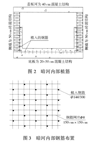 3 暗河加固方案 通过调查,发现暗河多处存在渗漏现象。为保护车站安全,防止车站施工时对暗河造成破坏,采取了以下施工保护方案。3.1 内部加固 结构补强防水加固。在暗河内浇筑钢筋混凝土内衬,起补强和防水作用。 (1)筑排水沟:在暗河加固范围内,距北侧边墙1.5 m处纵向筑一道高1.5 m、厚50 cm的砖墙,将剩余3 m在上游砌墙封堵,使暗河内流水从北侧排走;同时将通入暗河侧墙的管沟内流水用PVC管引至北侧水沟内,保证南侧3 m无水作业。 (2)清污垢:洞内明水引排后,对暗河底板、内壁进行清理,除去浮渣、松散物,并用净水冲洗干净,使混凝土结构能更好地与暗河原结构粘贴。 (3)植筋:为保证内衬能与暗河原结构成为一体,在暗河底板和侧墙上每隔30 cm梅花状植入长30 cm的Φ14钢筋1根,植入原结构内20 cm深,见图2、图3。