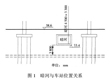 北京地铁呼家楼车站穿越暗河施工技术摘 要:介绍北京地铁呼家楼车站穿越暗河施工中采取的主要措施,通过施工方案和施工措施的比选,成功穿越了暗河。关键词:地铁车站;导洞施工;穿越暗河1 工程概述 呼家楼站是北京地铁十号线的中间站,位于东三环北路与朝阳北路交叉路口,与规划M6线呈十字换乘关系。车站沿东三环北路呈南北走向,受京广桥桥桩影响,站台分开设置在东三环北路两侧的辅路下,埋深10 m,站长179.5 m,车站设5个出入口,2组风亭、风道。 车站南段有一条暗河横穿车站,埋深2 m。原为一条明河,上世纪60年代改造为一条4.5 m×3.2m、埋深2 m的盖板河,侧墙为50 cm厚砖墙,顶板为40 cm厚钢筋混凝土预制盖板,底板为50 cm厚钢筋混凝土。主要排泄道路雨水、部分市政污水,常年水位20~50 cm,雨季水量较大,是朝阳区的主要排洪通道。2 暗河与车站位置关系 暗河位于车站主体上方3.8 m处。由于暗河常年积水且年代已久,有渗漏现象,主体施工时需采取防护措施。暗河与车站位置关系见图1。