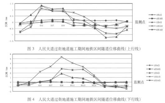 1 影响地铁区间隧道变形的主要因素 1号线区间隧道外径为6. 2 m,内径为5. 5 m, 由6块预制钢筋混凝土管片拼装而成,混凝土强度等级C50,抗渗等级S10。过街地道工程基坑施工引起的软弱地层变形对地铁区间隧道的影响很大,主要原因是: (1)坑内降地下水和抽取承压水; (2)超深开挖引起坑底土隆起; (3)基坑围护墙产生的变形。 上述因素给地铁区间隧道的安全带来了风险,如果控制和处理不当,将会严重影响1号线的正常运营。2 工程实施中的地铁保护措施和效果 本工程设计和施工的难点在于确保地铁区间隧道的安全。在总结了多年来大量有关地铁保护的设计施工理论与实践以及经验与教训的基础上,运用“时空效应”和“工程控制论”等理论制订和实施了本基坑工程实施过程中对区间隧道的一系列保护措施。 (1)由于过街地道工程基坑围护墙体的施工往往会引起地铁区间隧道的位移,我们选用了对周边土层影响最小的三轴搅拌桩,并在设计中明确,搅拌机必须具有纠偏装置,并规定具体压力、速度、喷浆量、水灰比、水泥掺量等施工参数,用严格的监测手段控制施工过程,达到控制隧道结构位移的目的。 (2)在坑内进行全断面的地基加固,改变原有土体的性质,以控制基坑底土体的隆起和坑内降水而引起的旁侧区间隧道的位移。 (3)充分利用软土地基的“时空效应”设计和施工方法,通过空间有限元法计算分析地铁区间隧道的变形。 (4)加大围护墙体的刚度,围护墙采用“插二隔一”的型钢水泥土搅拌桩。 (5)基坑内钢支撑体系的刚度要足够大,而且可以随时按需施加轴力,从而便于控制围护墙体的变形。 (6)设计要求在隧道的两侧开挖前预先设置跟踪注浆管,通过全自动监测仪器,对区间隧道的位移进行跟踪监测,及时按需主动注浆,补偿土体扰动产生的空隙,从而控制隧道结构的变形。 从工程实施过程的监测资料可以看出,上述地铁区间隧道的保护措施是成功的。工程中,围护体变形极小,均在6 mm以内(见图3、图4)。