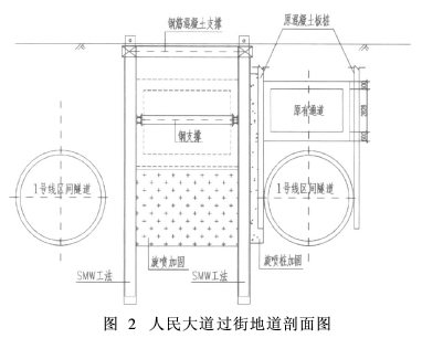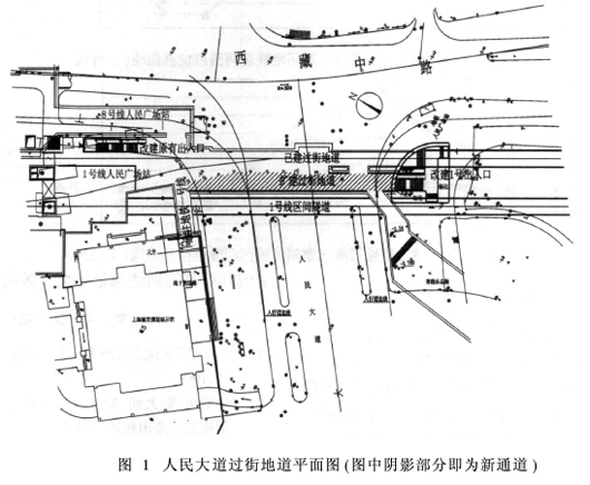 上海人民大道过街地道设计施工中的地铁保护措施摘 要:基坑工程的实施往往会对周边已建或在建的地铁车站及区间隧道产生影响,针对这一问题,介绍了上海市人民大道过街地道扩建工程中采用的一系列地铁保护、控制区间隧道变形、确保地铁正常运营的技术措施和效果。关键词:基坑工程;地铁保护;区间隧道;变形 人民广场是上海市中心的重要公交枢纽,轨道交通1、2、8号线在此均设有车站。随着人民广场地区客流量的不断增大,原有的人民大道南北过街地道已无法满足正常的通行要求,故需在原地道旁另辟一条平行的新通道(见图1),并与原有地道打通,合成一条过街地道。而该新建地道恰好位于1号线两条区间隧道中间(见图2),距离区间隧道仅1m左右;同时,该工程地处市中心繁华区,基坑开挖深度达8. 15m。因此,对周边环境保护要求很高,系属超一级的基坑保护等级。