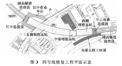 可见,在工程每个时期内对每一个关键节点都要进行风险管理,做到风险的动态控制与管理。每个节点的风险管理步骤与流程即为一个风险单元。 风险节点阶段的划分原则:①根据工程的风险点数量确定阶段数量的原则;②前一阶段的实施结果可能影响后一阶段的风险辨识、评估与控制为原则。2 动态风险管理在四号线修复工程中的应用2·1 工程概况 四号线工程原位修复方案主要可分为三大部分:①原隧道损坏部分的基坑明挖方案 根据工地周边环境情况综合考虑,该方案由东、西、中三个明挖基坑组成,长度分别为174、62.5m和27m,基坑标准段的开挖深度为38m,端头井的开挖深度达41m,围护结构采用1.2m厚的地下连续墙,所有地下连续墙的深度均为65.5m,总工程量约45 500m3;②浦东、浦西两段完好隧道的清理工作 由于四号线事故抢险期间,隧道损坏段两端的完好隧道中充满了水,并留下了一些抢险时修筑的水泥坝等障碍物,因此修复工程要对该两段隧道进行清理工作;③新建隧道与老的完好隧道的连接段施工 为保证完成基坑内部结构与清理完毕的完好隧道实施结构对接,必须在基坑两端实施水平冻结后暗挖来完成连接结构。江中段冻结暗挖的长度约10m,中山南路段冻结暗挖长度约9m(见图3)。