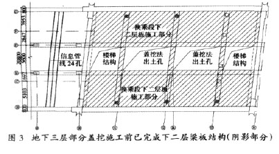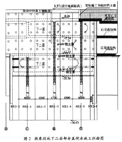 本工程地下水主要有浅部土层中的潜水,及深部粉性土、砂土层中的承压水。上海年平均水位埋深在0.5~0.7 m,低水位埋深1.50 m。现场测得的地下水位埋深一般在1.15~1.25 m之间。2 盖挖法施工过程2.1 换乘段基坑施工环境 换乘段13轴线~14轴线顶板以及B区顶板结构已经完成(原设计中换乘段顶板应完成12X轴,~14轴,但由于交通组织等原因变更施工范围,浅部临时围护结构亦由拉森钢板桩改为临时挡土墙),并且完成覆土回填;B区(14轴地下连续墙以西)中板及底板结构已经施工完成(图2);⑨~⑩轴线之间有24孔信息管线穿越基坑并实施原位保护。